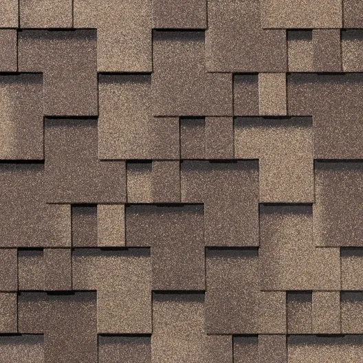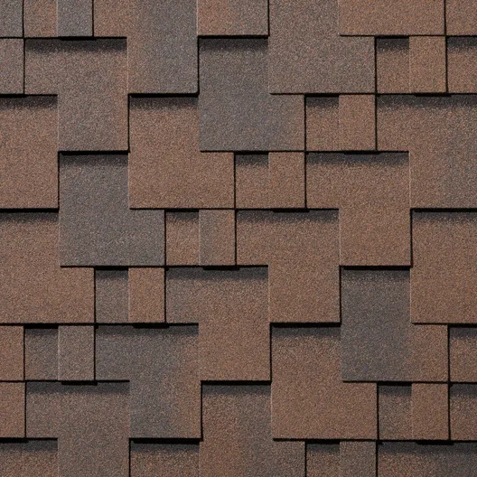Серия Gallery цвет Каштан - это насыщенный коричневый с едва уловимой примесью красного тона: оттенок, вдохновленный плодами каштана. Черная полоса в верхней части гонта (придающая объём) в совокупности с геометрическими формами, где каждая линия находится на своём месте - это идеальный дуэт, который, вероятно, и является классикой гибкой черепицы на рынке России.